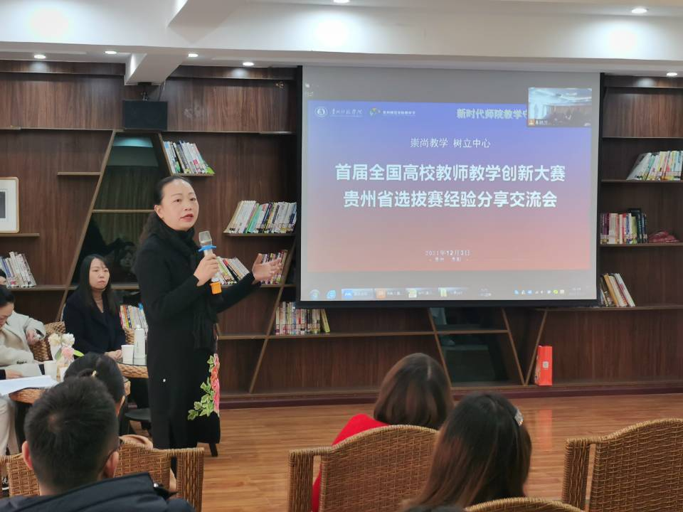 本网讯 为帮助我校教师有效备战第二届全国高校教师教学创新大赛,根据第二届贵州师范学院教学节活动安排,2021年12月3日下午,新时代师院教学守正与创新——首届全国高校教师教学创新大赛贵州省选拔赛经验分享交流会在文韬苑大学生就业指导与服务中心举行。各教学单位分管赛事领导及拟参加第二届教师教学创新大赛教师共60余人参加会议,会议由教务处处长邓琴主持。首届教师教学创新大赛省赛获奖团队教师、优秀赛事团队代表分别从创新大赛过程、教学创新成果报告、教学设计创新现场汇报、赛事团队打造等方面分享了经验。
