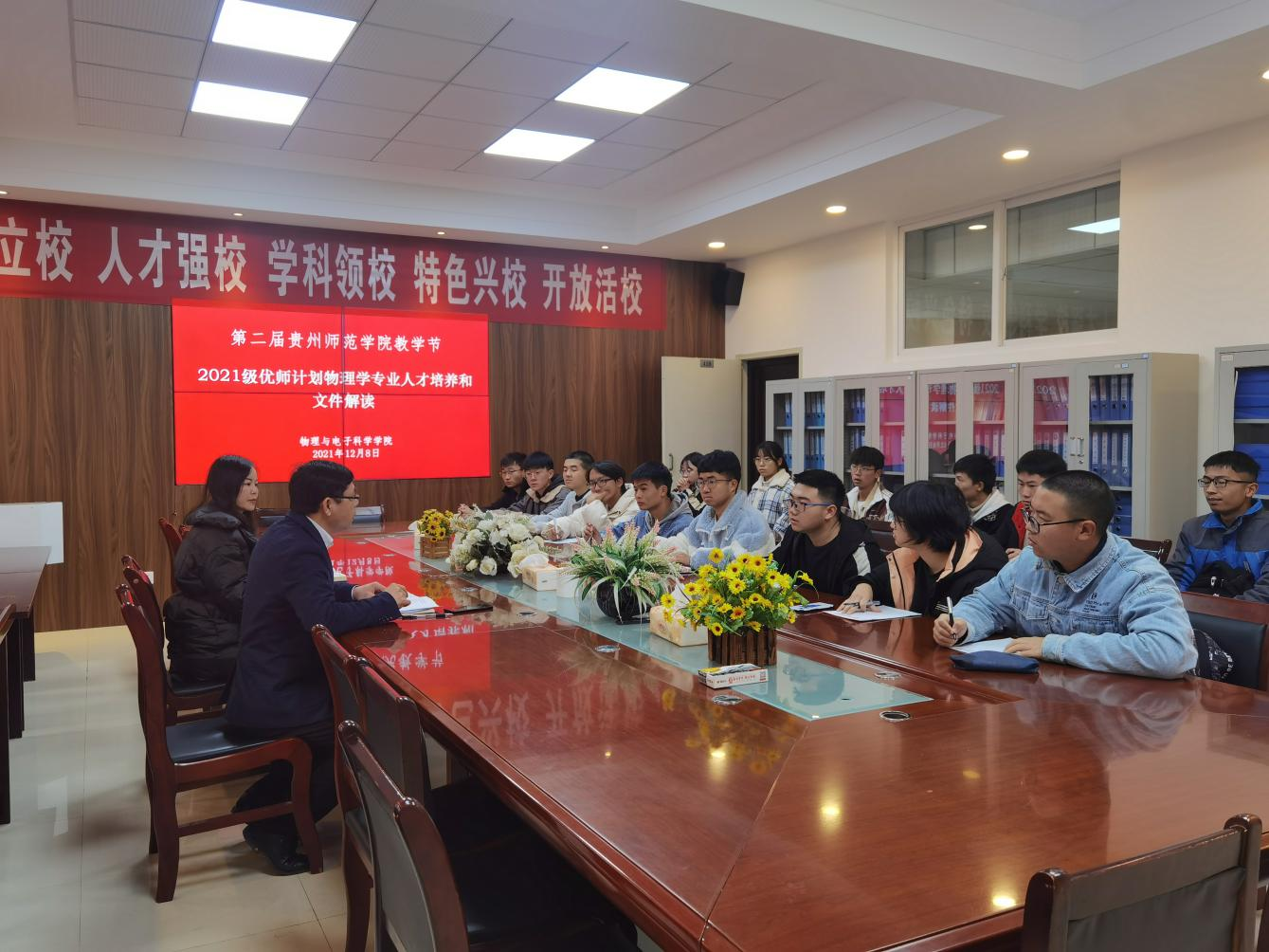 本网讯 为贯彻落实省教育厅关于做好我省优秀教师定向培养计划等相关通知要求,造就一批有理想信念、有道德情操、有扎实学识、有仁爱之心的“四有”好老师,建设高质量中小学教师队伍。12月8日上午,物理与电子科学学院副院长刘高福在学院会议室召开“优师”计划学生人才培养要求并传达了教育厅和学校的相关文件精神,2021级物理学专业15名“优师”计划的学生参加了此次会议。本次会议由学院教学秘书张力沣主持。