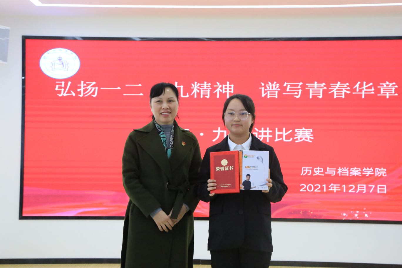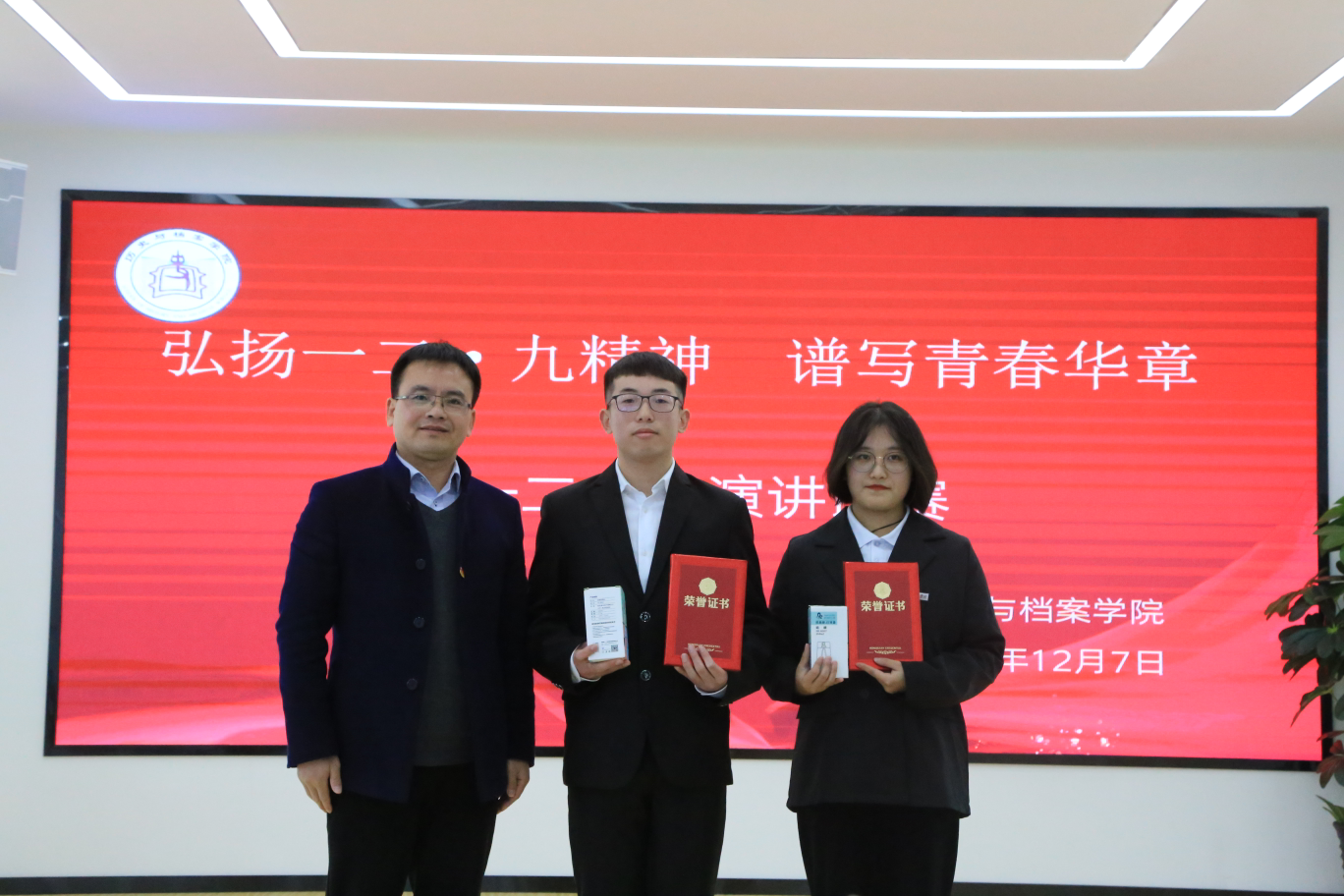 本网讯 为切实组织开展好教学节系列活动,加强爱国主义教育,引导青年学生继承革命传统、牢记历史、弘扬民族精神,历史与档案学院于12月7日在大学生事务服务中心开展了主题为“弘扬一二•九精神,谱写青春华章”的演讲比赛决赛。学院党委书记吴靖霞、院长梁瑞、党委副书记黄美诤、历史学系系主任朱更勇、档案学系系主任刘凯、学生第一党支部书记梁中美、团学负责老师王秋实出席比赛现场。