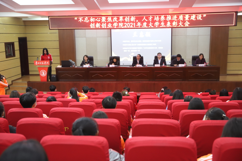 本网讯 2021年11月26日下午创新创业学院于在道德讲堂隆重举行创新创业学院2021学年度大学生表彰大会。出席本次大会的有贵州师范学院党委委员、副校长、创新创业学院院长熊世桓,创新创业学院执行院长杜宏博,创新创业学院副院长谭韬,创新创业学院副教授、科研管理、大创办主任刘世华,创新创业学院办公室主任、工会委员邱琴,创新创业学院教师代表冯颖、陈非帆、韦南京、钟蕙、陈蕾、叶波、谢玉恒以及创新创业学院全体同学,本次大会由创新创业学院团总支书记李慧君主持。