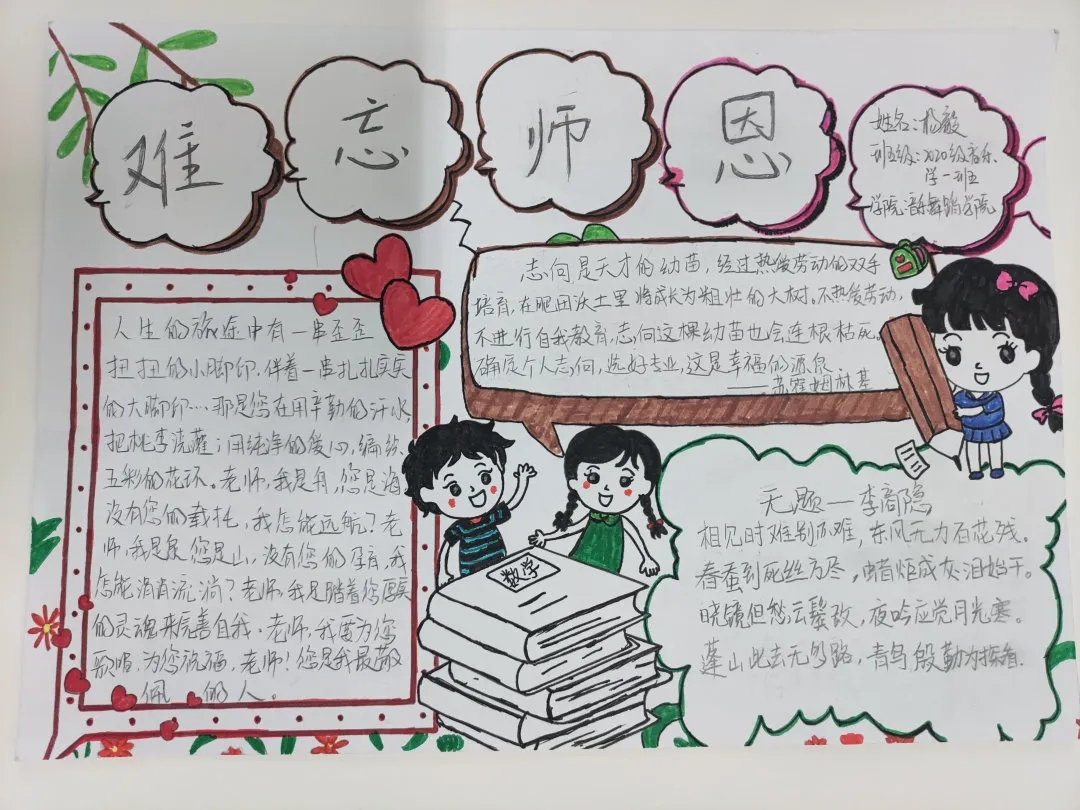 本次活动以“感谢那些年,老师陪我们一起走过”为主题。手抄报通过学生精心编排、设计,板式新颖多样,主题鲜明,字迹工整清晰,色彩纷呈,以丰富的语言文字和插图,创作出一幅幅内容紧紧围绕感恩教师这一主题的手抄报,字里行间无不透露出对老师的崇敬与爱戴,为敬爱的老师们献上一份珍贵的礼物。